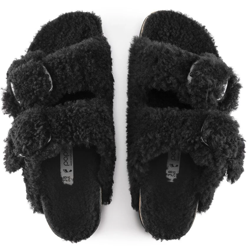 The iconic Arizona two strap sandal, now available in all over teddy shearling. Extra cozy, extra comfortable with amplified big buckles for a bold style.
