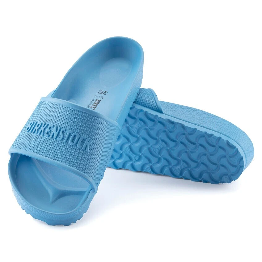 The BIRKENSTOCK Barbados is a sporty slide design with an embossed upper and logo lettering. Modeled on the cork sandal, this sandal is made from one piece of light, flexible and waterproof molded EVA.