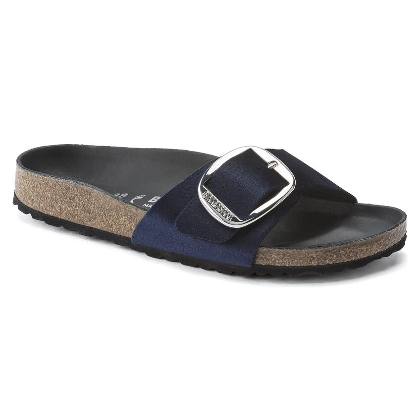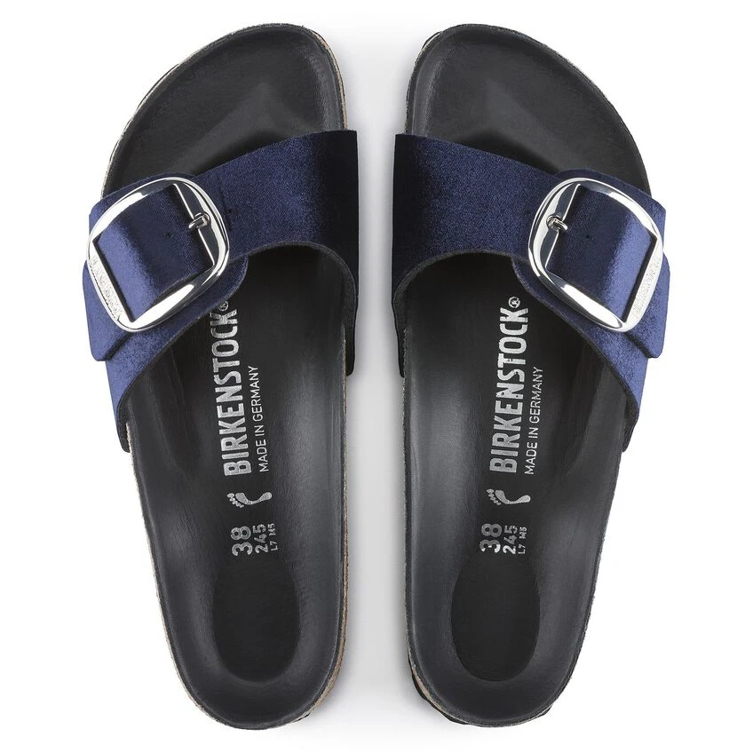 The original BIRKENSTOCK Sandal. A strap, a buckle, and a contoured cork footbed are masterfully combined to create the Madrid. This version is made of fine, luxurious velvet and boasts a big, elegant pin buckle. The footbed is fully lined with soft smooth leather.